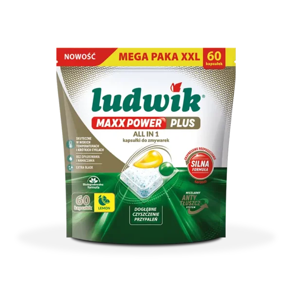 Ludwik Maxx Power Plus All-in-1 dishwasher capsules combine cleaning agents and a shine booster to tackle grease, tea stains, and baked-on food—even in eco or short cycles. Designed for modern kitchens, they perform efficiently at low temperatures without pre-rinsing, helping you save water and energy.